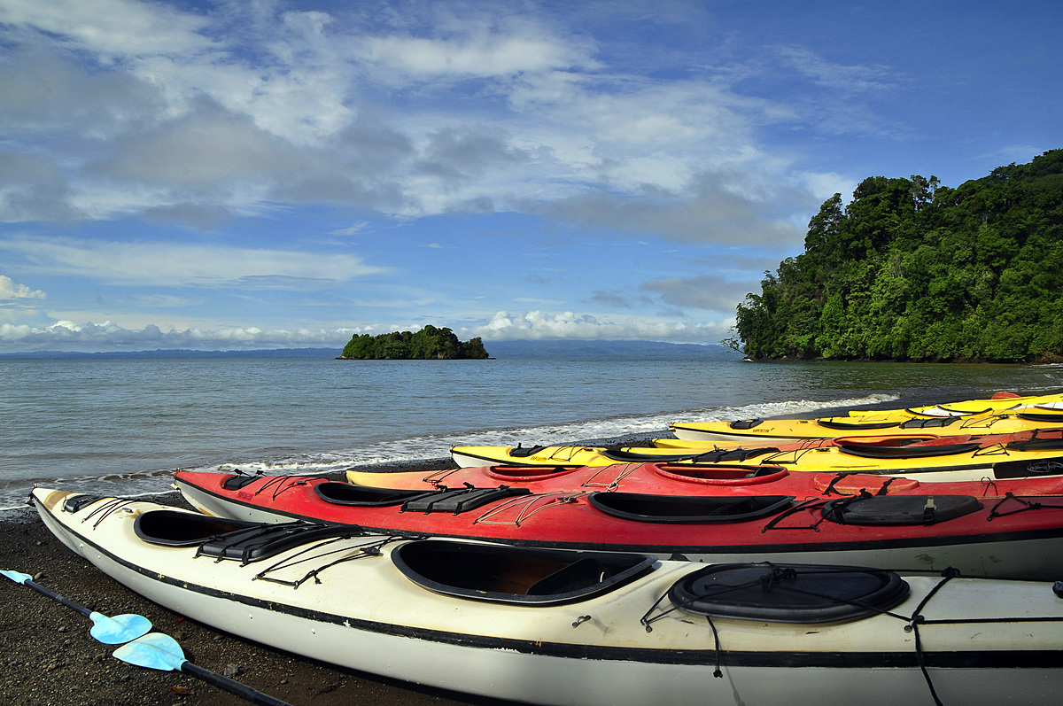 Morning nature walk. Breakfast. Two optional outings for the day according to tides; paddle along the shore and enter the Esquinas River to explore the beautiful mangroves, look for wildlife, this is a special place to find the secretive Mangrove Tree Boa. The group might also choose to paddle along the shore for a few minutes to approach some rocky reefs that are quite interesting for snorkeling. Bioluminescence is also a phenomenon often seen along the shore of this tropical fjord, sunsets are spectacular.
